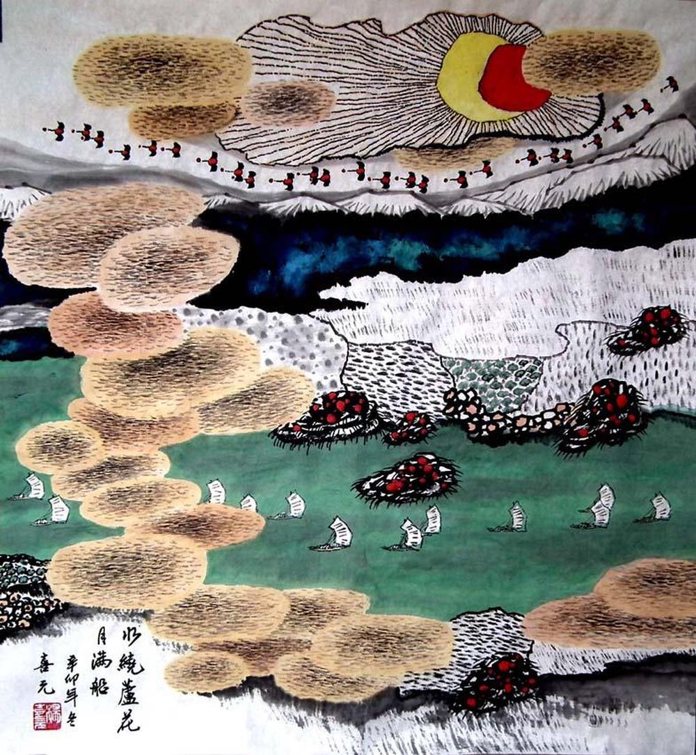 立意: 清晨,细雨过后,彩云飘动,群鸿争鸣,掠过半空,留下一道美丽的风景线。地上河水涟漪,白帆片片,百舸争流,天人合一,浑然一体。构图: 平面构成,从许多事物中抽出共同本质的属性,排除杂乱现象,用单纯的概括的形的意识注视它们,用点线面将其符号化,利用色彩,矛盾进行重新组合,形成美的概念。格调: 建立在笔墨的法则上,是写实的升华,是跨区域,跨国界,品位高雅的表现形式,此乃善画者所追求的艺术语言,给善读者充分的想象空间。